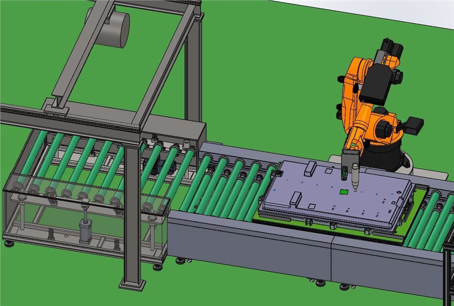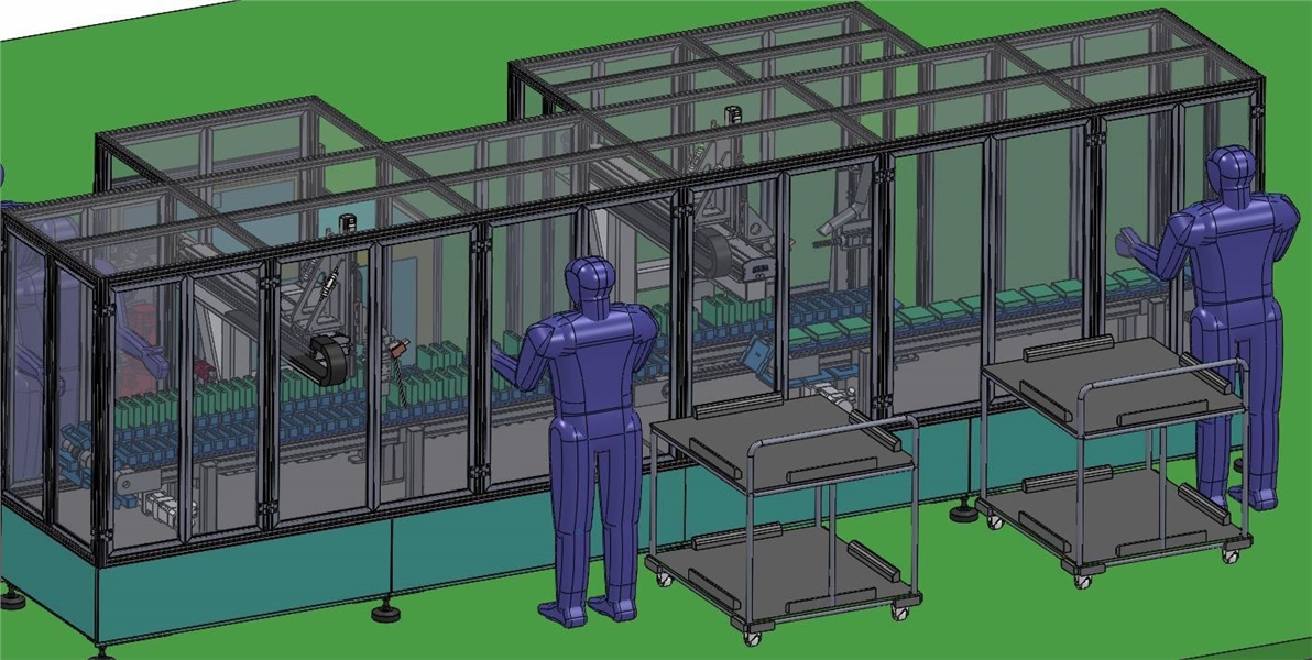 8. 取走电芯:人工将单个电芯搬运到模组分选输送线上。