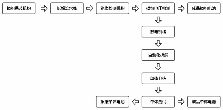 本工艺主要针对于动力电池模组的拆解工序布局,布局用于动力电池的梯次利用;